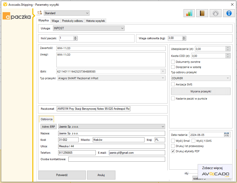 Po wybraniu z listy dokumentu, do którego chcemy wygenerować przesyłkę powinieneś zobaczyć poniższy widok. Dane pobierane są z systemu ERP, można je edytować.
