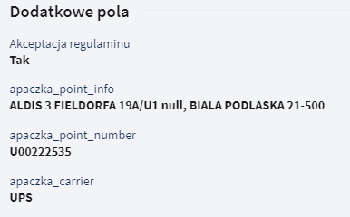 Informacje o punkcie odbioru przesyłki będą widoczne w szczegółach zamówienia w sekcji Dodatkowe pola. Dane punktu zostaną także przesłane do systemu Apaczka.pl podczas wykonywania importu.