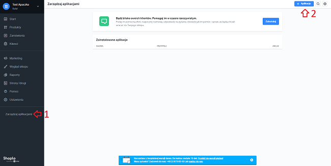 2. W menu po lewej stronie wybierz Zarządzaj aplikacjami, a następnie + Aplikacje. W nowej karcie przeglądarki otworzy się strona Shoplo.