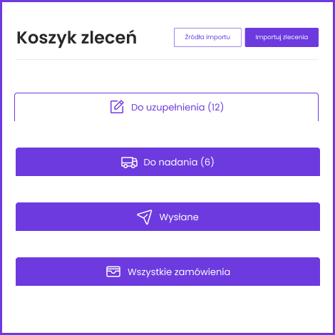 Zarządzaj wieloma przesyłkami jednocześnie – nawet z różnych firm kurierskich. Koszyk zleceń podzielony jest na zakładki, dzięki którym wiesz, na jakim etapie jest każda paczka: