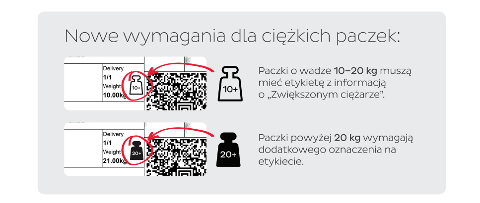 • 20+ kg – paczki powyżej 20 kg wymagają dodatkowego, wyraźnego oznaczenia na etykiecie.