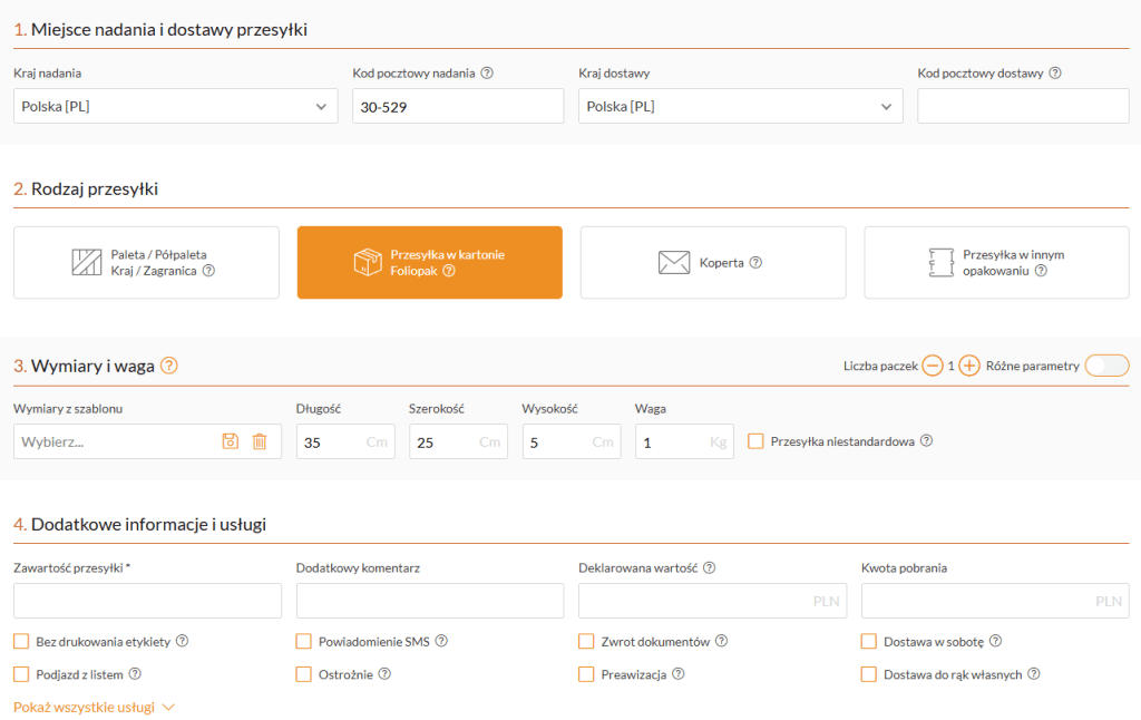 Po zalogowaniu zostaniesz przekierowany do panelu klienta, gdzie wypełnisz krótki formularz. Będziesz musiał podać podstawowe informacje o przesyłce, takie jak: