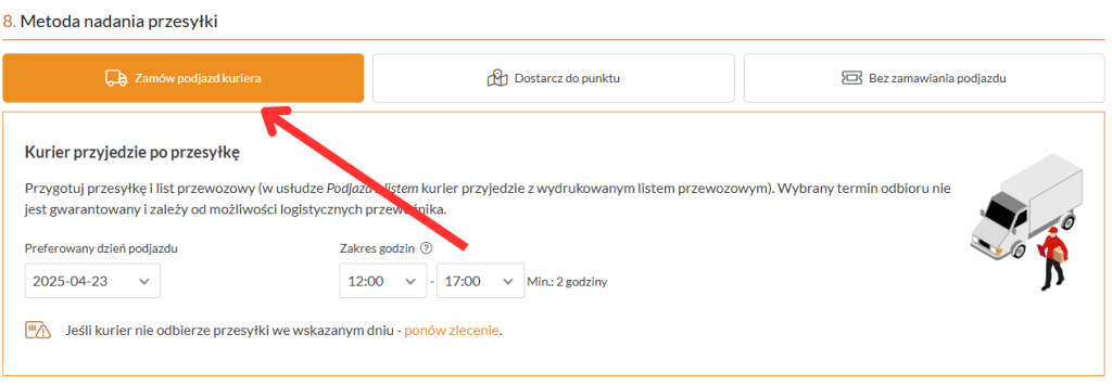 Po wybraniu przewoźnika, wystarczy wprowadzić dane nadania i dostawy, a także wybrać metodę nadania paczki. Jeśli chcesz, by kurier przyjechał po paczkę pod Twoje drzwi, zaznacz opcję „zamów podjazd kuriera”.
