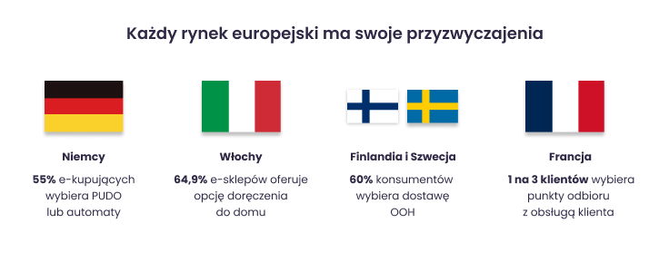 Te różnice nie są detalami — to czynniki wpływające na konwersję i lojalność klientów. Jeśli sklep internetowy ignoruje lokalne przyzwyczajenia, może stracić zaufanie już przy pierwszej próbie dostawy. Co więcej, dane z całej Europy pokazują, że klient coraz rzadziej wybiera dostawę „pod drzwi”. W 2024 roku aż 59 % europejskich kupujących online zadeklarowało, że wybrałoby dostawę OOH. W praktyce oznacza to, że nie wystarczy „obsługiwać wysyłki zagraniczne”. Trzeba je zaprojektować tak, jakby były jak lokalne.