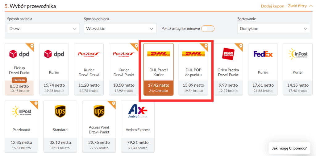 W punkcie piątym tego formularza czeka na Ciebie nasza porównywarka usług kurierskich, czyli niezwykle pomocne narzędzie, które klarownie prezentuje dostępne opcje wysyłki. To właśnie tutaj, spośród różnych propozycji, z łatwością odnajdziesz i zaznaczysz tę usługę DHL, która idealnie odpowiada Twoim aktualnym potrzebom i preferencjom.