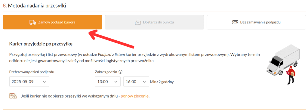 Nie mniej ważny jest punkt ósmy formularza. Jeśli zależy Ci na maksymalnej wygodzie i zamówieniu kuriera bezpośrednio pod drzwi firmy, magazynu czy biura, pamiętaj o zaznaczeniu opcji „zamów podjazd kuriera”.