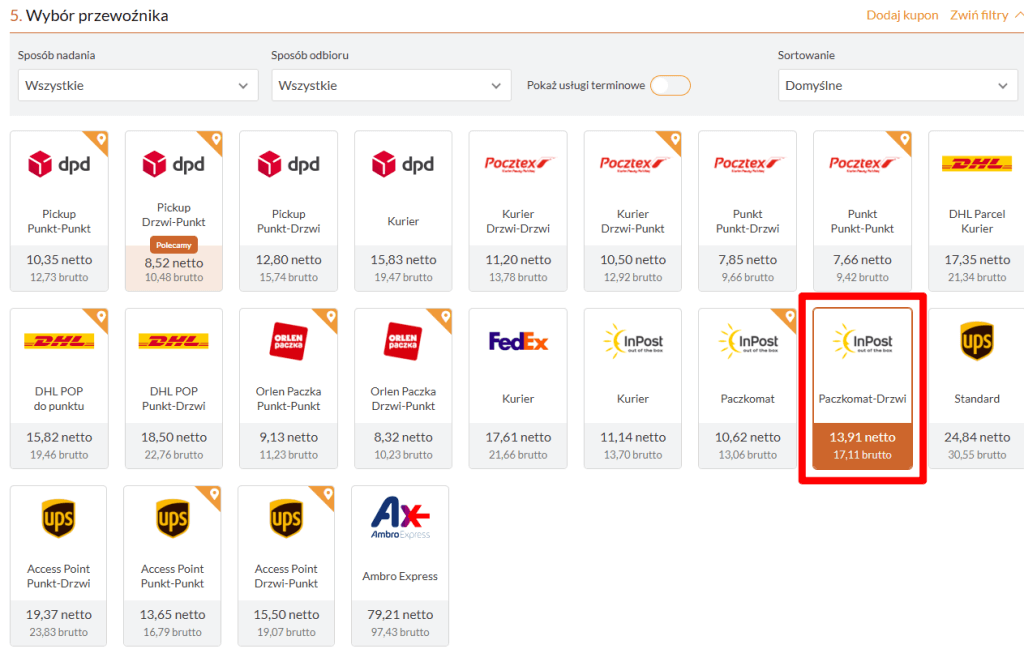 Tutaj, naturalnie, skupiamy się na opcji Paczkomat® InPost. To ważny moment: w większości przypadków zwroty do sklepów internetowych powinno odsyłać się pod wskazany adres, najczęściej siedziby firmy lub magazynu, podany na stronie sklepu. Dlatego też, w takim scenariuszu, należy zaznaczyć opcję „paczkomat-drzwi”. Oznacza to, że Ty nadajesz paczkę w Paczkomacie® (punkt), a kurier dostarcza ją bezpośrednio pod adres odbiorcy (drzwi).