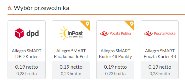 Dajemy Ci możliwość wysyłania paczek Allegro Smart poprzez wygodny Panel Klienta Apaczki. Wystarczy, że zaimportujesz swoje przesyłki z Allegro –> do Apaczka.pl w ramach aktywnego pakietu Apaczka PRO Smart. Do wyboru masz kilku przewoźników: