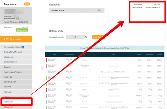 Wyloguj się z Apaczka i zaloguj się ponownie do Panelu Klienta. Następnie w zakładce  Rozliczenia sprawdź aktualny stan konta. (Uwaga! Opóźnienia mogą również być spowodowane awarią po stronie banku lub operatora Przelewy 24).