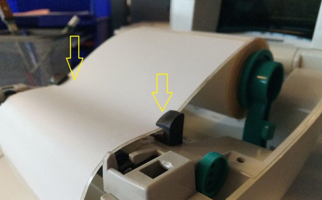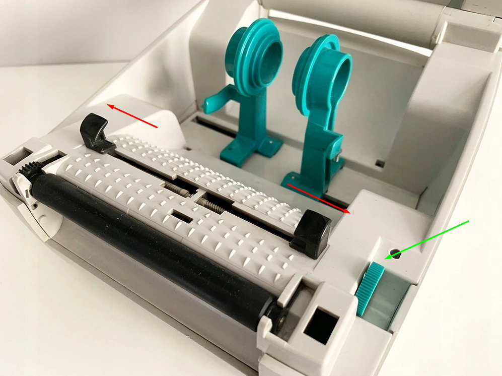 2. W kolejnym kroku należy rozsunąć czarne prowadnice za pomocą zielonego kółka i przełożyć etykiety pomiędzy prowadnicami, tak aby etykieta nie ruszała się na boki, ale na tyle mocno by nie miała możliwości zaklinowania się bądź przemieszczenia.