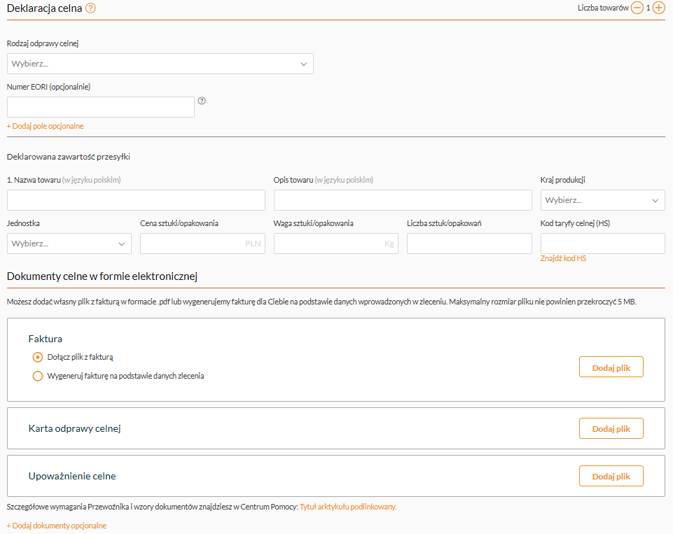 Ważne! Dodanie dokumentów elektronicznie nie jest obowiązkowe, możesz je dołączyć do przesyłki w formie papierowej. Rekomendujemy jednak korzystanie z formy elektronicznej.