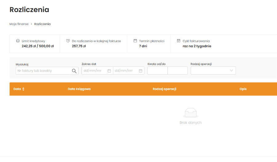Aby sprawdzić swój cykl rozliczeniowy, w górnym menu kliknij w ikonę z portfelem a następnie w zakładkę Rozliczenia . Informacja znajduje się w na górze strony pod hasłem Cykl fakturowania