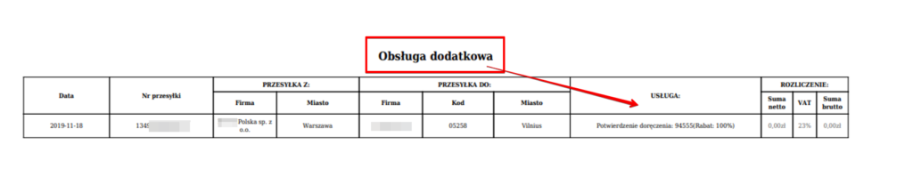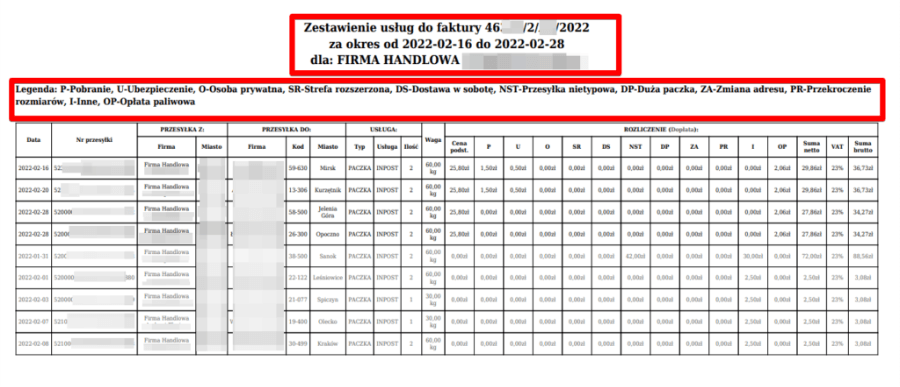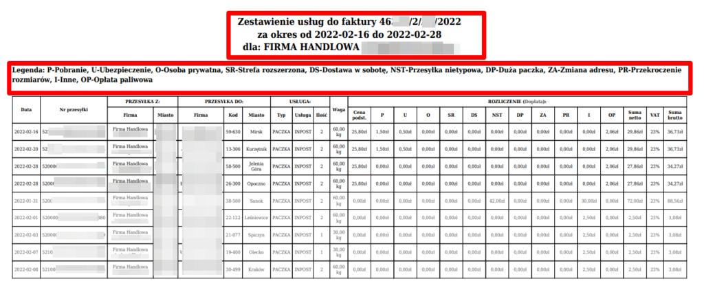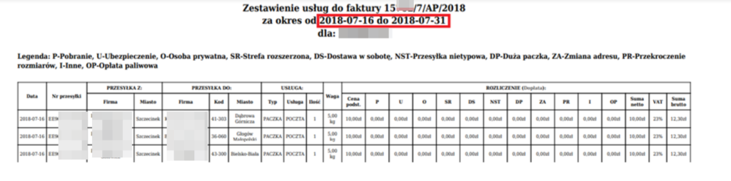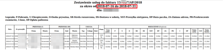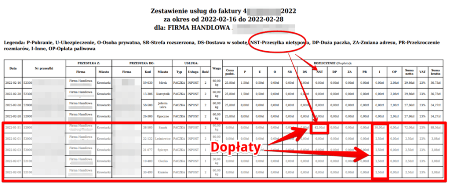 Przesyłki, do których zostały naliczone dodatkowe opłaty, na specyfikacji najczęściej wyświetlone są na końcu.
