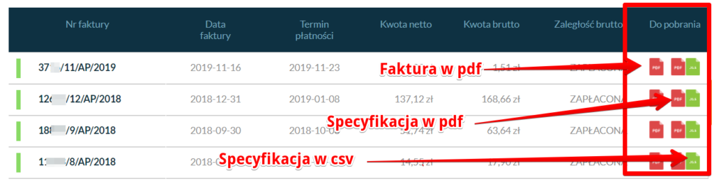 Wystarczy kliknąć na ikonę faktury lub specyfikacji, aby pobrać plik w formacie pdf lub pdf / csv dla specyfikacji.