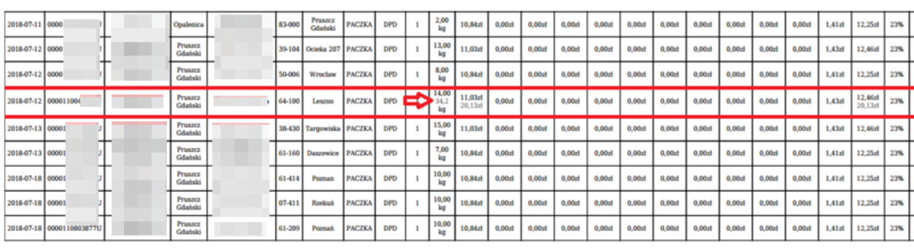 Powyższa dopłata widnieje w kolumnie „waga”, co mówi nam, że przesyłka została przeważona i prawdopodobnie waga bilingowa bądź rzeczywista jest większa od tej, którą zadeklarował klient przy składaniu zlecenia.