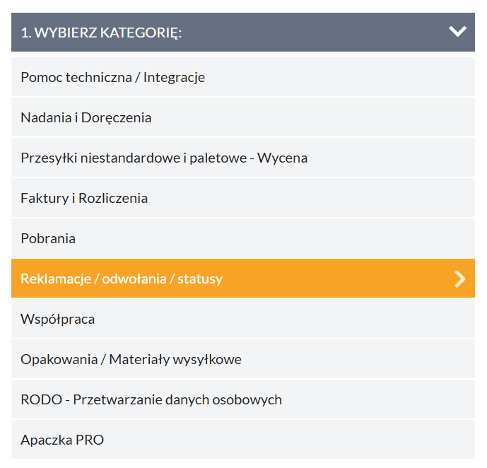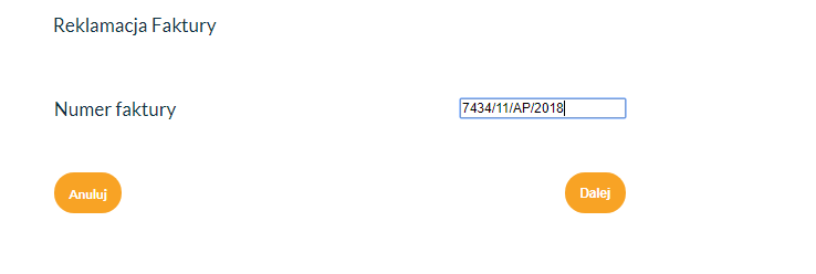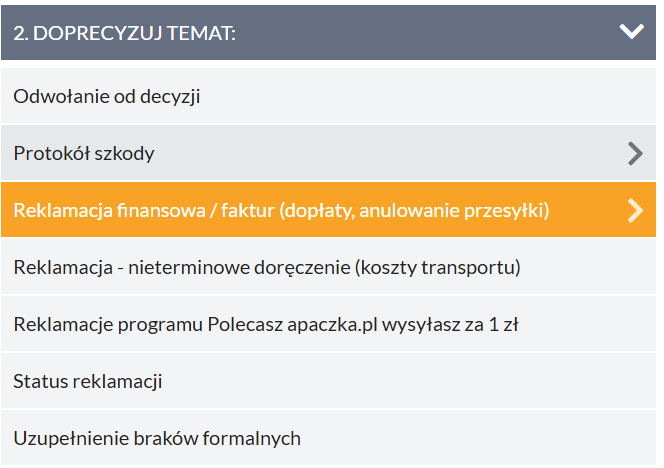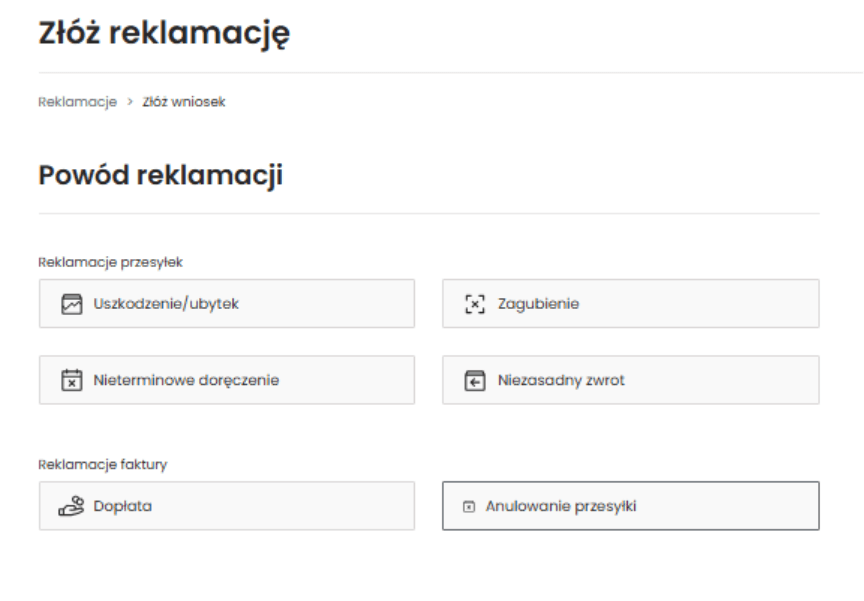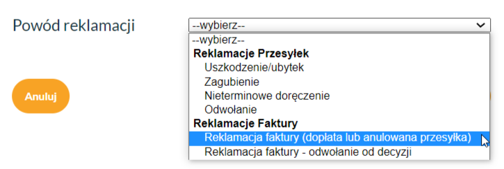 – Wybierz powód reklamacji – „Reklamacja faktury (dopłata lub anulowana przesyłka)” i kliknij Dalej.
