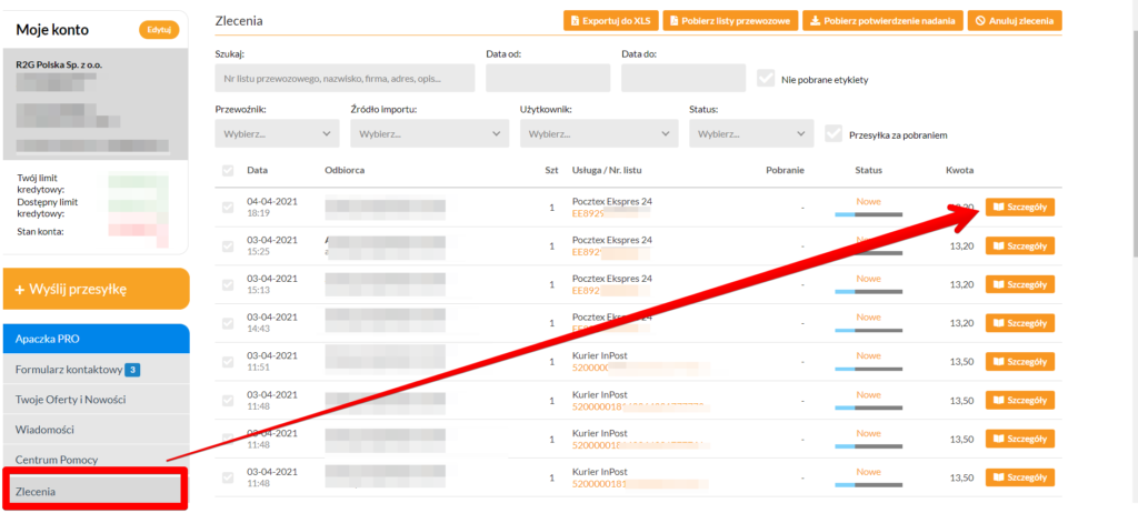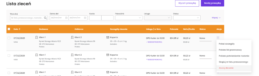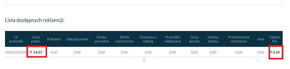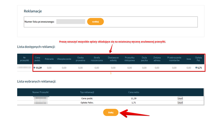 – Wybierz z listy anulowaną przesyłkę i zaznacz cenę podstawową oraz dopłatę paliwową, a także wszystkie usługi dodatkowe.