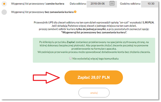 1. Zaloguj się do Apaczka.pl, uzupełnij dane dotyczące zlecenia, a następnie na końcu strony zatwierdź płatność, klikając Zapłać.