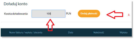 Następnie:1. W rubrykę „kwota doładowania” wpisz kwotę, którą chcesz doładować konto, np. 100 zł i kliknij „Dodaj płatność”.