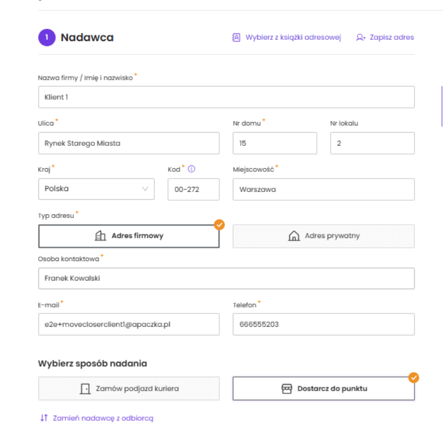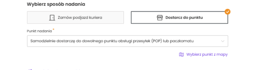 Uzupełnij dane Odbiorcy i wybierz taki sam sposób dostarczenia – Dostarczenie do punktu