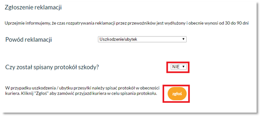 Jeśli pomimo zgłoszenia, kurier się nie pojawi, prosimy o złożenie reklamacji w systemie bez ww. dokumentu oraz niezwłoczne poinformowanie o braku podjazdu kuriera. Ze względu na fakt, że protokół szkody jest wymaganym dokumentem w przypadku reklamacji na uszkodzenie, prosimy o załączenie w systemie oświadczenia zamiast protokołu.