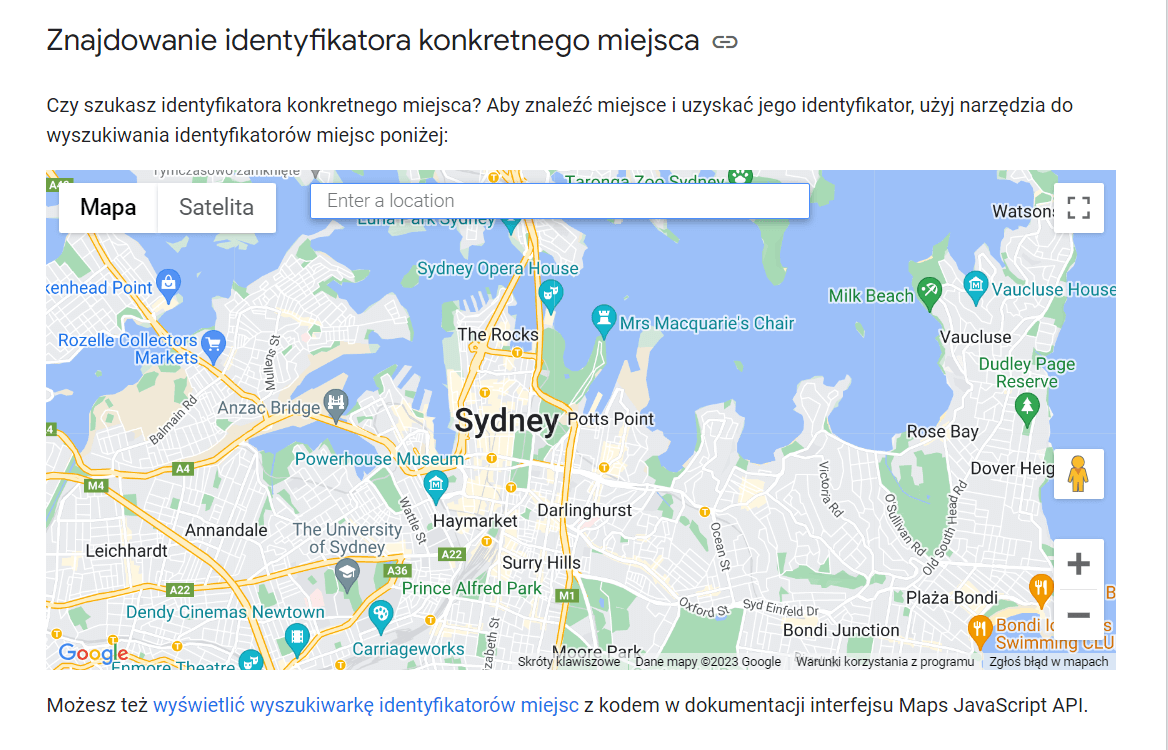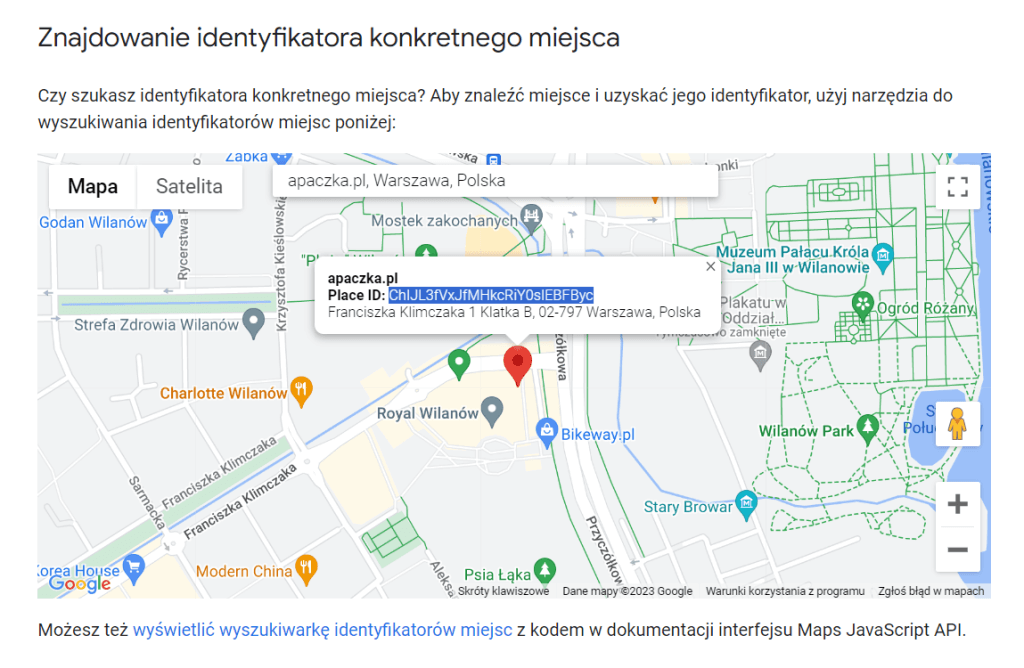 Aby znaleźć swój Place ID, wystarczy wejść w poniższy link: https://developers.google.com/maps/documentation/places/web-service/place-id?hl=pl następnie w sekcji „Znajdowanie identyfikatora konkretnego miejsca” odszukać mapę z wyszukiwarką, która znajduje się w górnej części mapy z hasłem „Enter a location”.