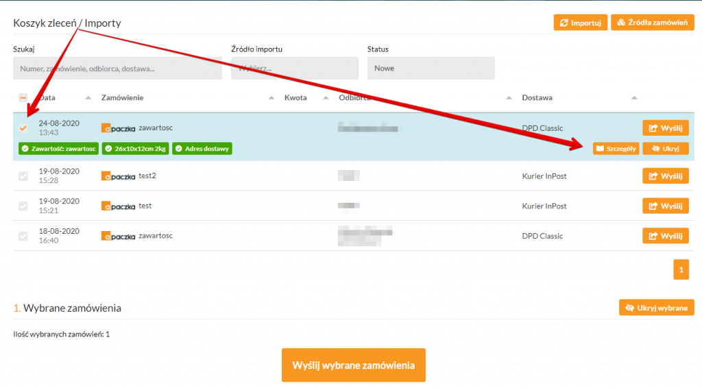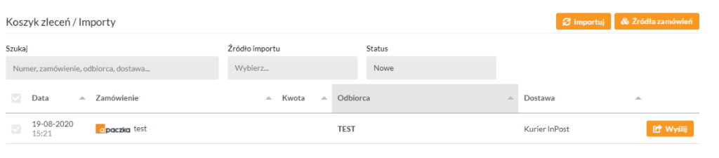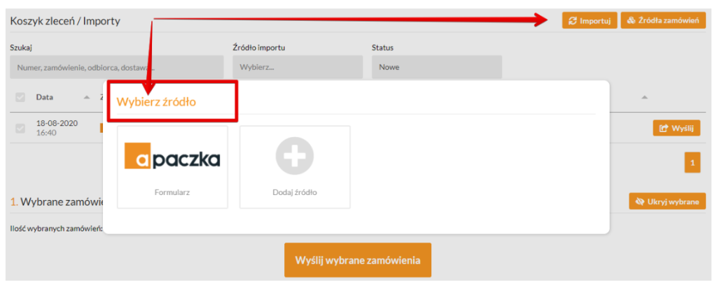 1. Zaloguj się do Panelu Klienta, wybierz zakładkę Koszyk zleceń / Importy. W koszyku mogą znaleźć się zarówno zamówienia pochodzące z importu z systemu zewnętrznego, jak i dodane do koszyka w formularzu wysyłkowym Apaczka.