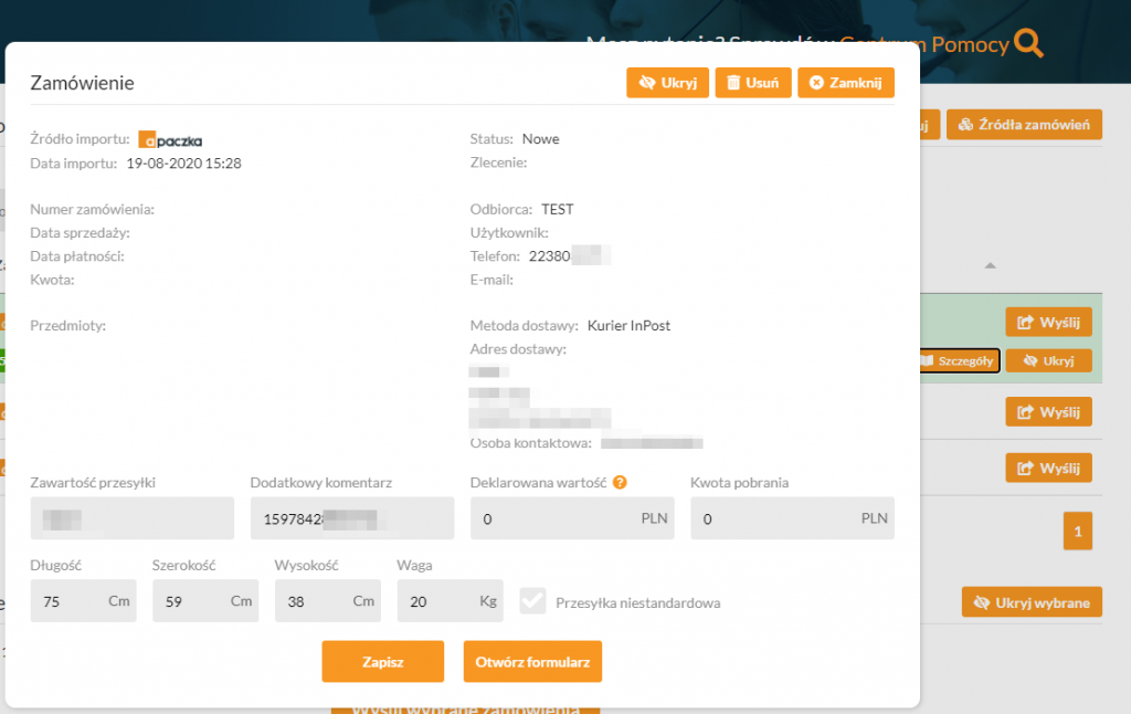 • edytować formularz wysyłki z wypełnionymi wcześniej danymi.