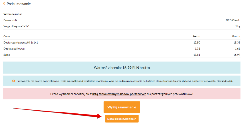 1. Zostaniesz przeniesiony do formularza wysyłkowego. Wypełnij formularz, tak jak przy wysyłce pojedynczej paczki, a następnie wybierz opcję „Dodaj do koszyka zleceń”.
