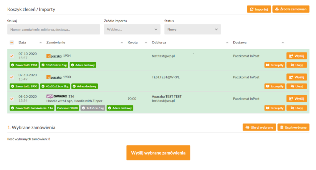 2. Zaznacz zamówienia, które chcesz wysłać zbiorczo i wybierz Wyślij wybrane zamówienia. Zamówienia mogą pochodzić z różnych źródeł, ale MUSZĄ mieć jednego, wspólnego przewoźnika/ dostawcę.