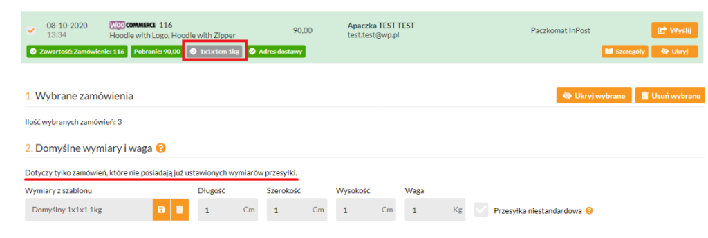• Wymiary i wagę zamówień można wprowadzić w kroku drugim. Zastosowane będą do wszystkich wysyłanych zamówień, dla których wymiary nie zostały wcześniej zdefiniowane.