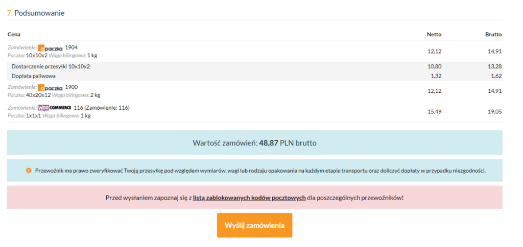 3. W podsumowaniu widoczny będzie koszt przesyłki dla każdego zamówienia. Klikając na dowolne zamówienie dostępny będzie szczegółowy podgląd kosztów przesyłki.
