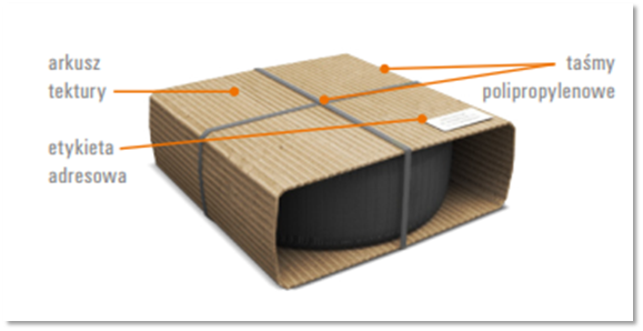 Opona powinna być owinięta pojedynczym arkuszem kartonu odpowiedniej długości. Pakunek należy zabezpieczyć prawidłowo taśmą polipropylenową. Taśma nie może zakrywać etykiety adresowej.