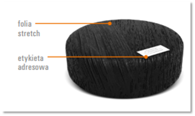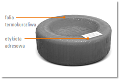 Należy oponę owinąć folią typu stretch odporną na rozdarcie. Folia musi zakrywać co najmniej 3/4 jej powierzchni. Otwory w folii po obu stronach ułatwią przenoszenie. Etykieta adresowa powinna być naklejona na płasko.