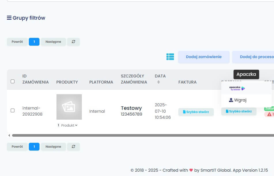 Integracja widoczna będzie podczas szybkiego nadawania zlecenia lub z poziomu szczegółów zlecenia. Po wybraniu Apaczki pokażą się wszystkie utworzone połączenia, aby usprawnić wybór konkretnego serwisu do nadania przesyłki.