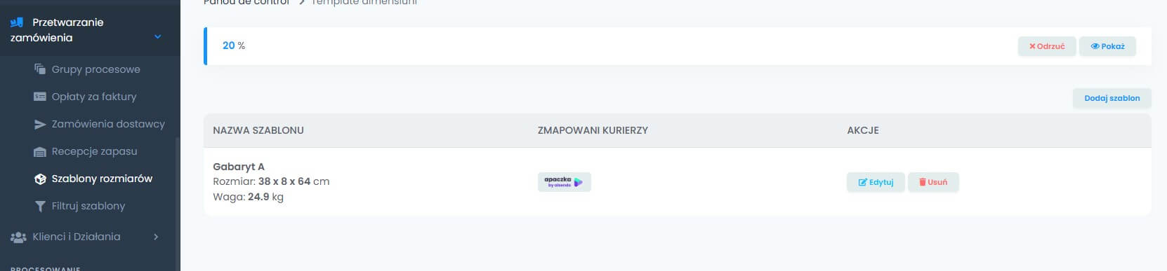Szablony wysyłkowe utworzysz w zakładce: Przetwarzanie zamówienia->Szablony rozmiarów