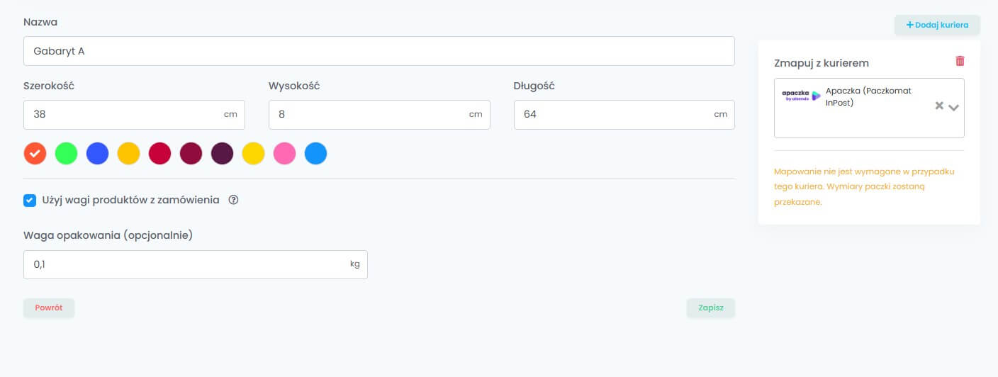 Wybierając „Dodaj szablon” będziesz mógł zdefiniować jego nazwę, wymiary oraz wagę (możliwe przypisanie wagi produktów z zamówienia) oraz zmapować dedykowane połączenie, dla którego szablon ma być widoczny. Np. przygotowanie gabarytów Paczkomatów (A, B, C) i przypisanie ich dla konkretnego połączenia w tym wypadku Paczkomat InPost.